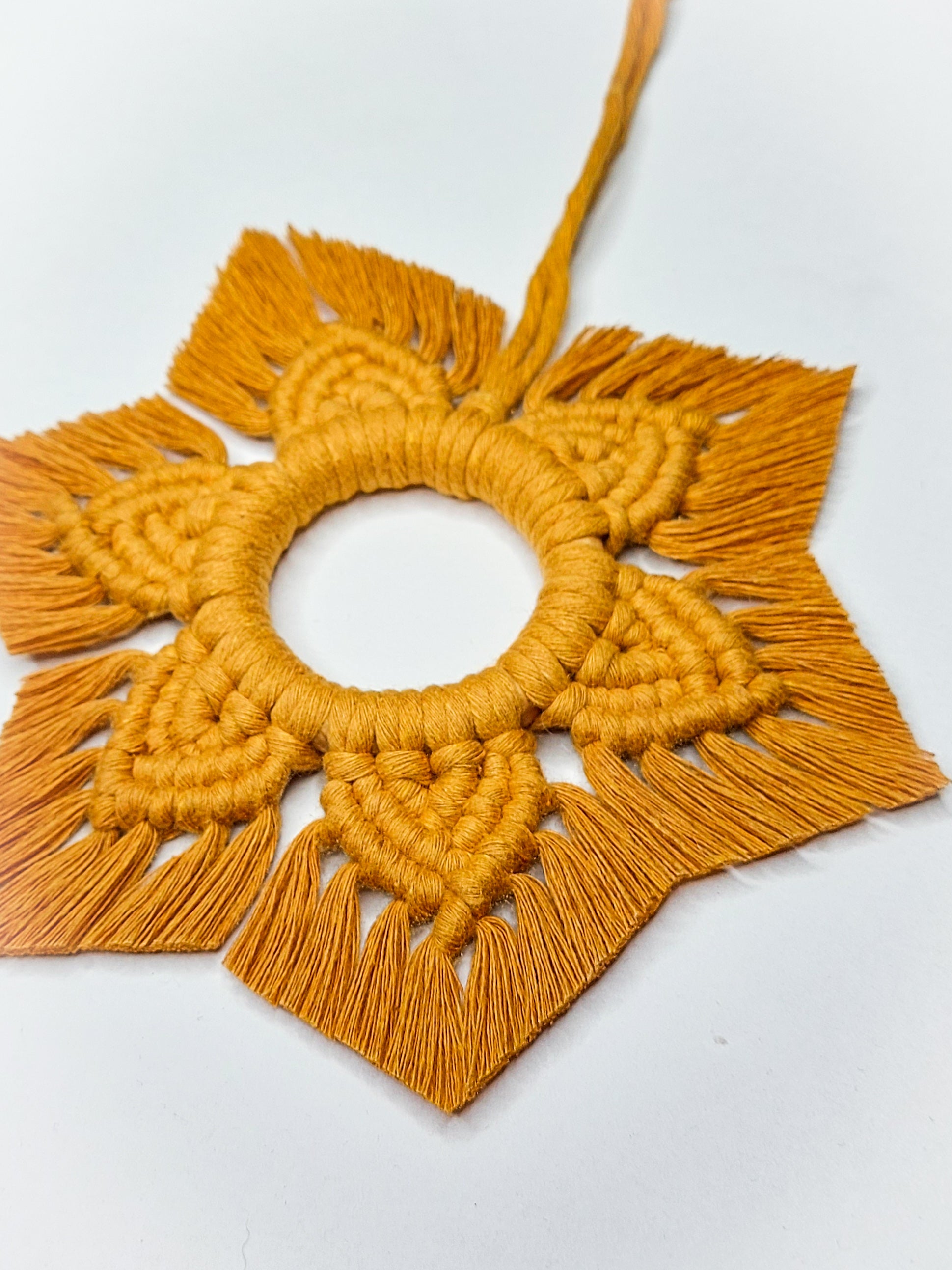 Stjarnan er hnýtt á 7cm viðarhring og er u.þ.b 20 cm á breidd.